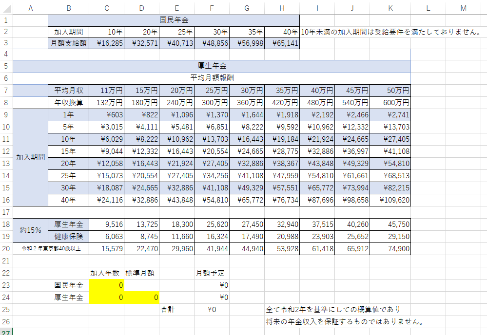 この表に記されている数字も、調整率とか年金の支払額というのも、あくまでも令和2年度のものですので今後変わっていく可能性は充分にあります。国民年金を、たとえば……黄色い入力欄の加入年数は年ベースで入力してください。