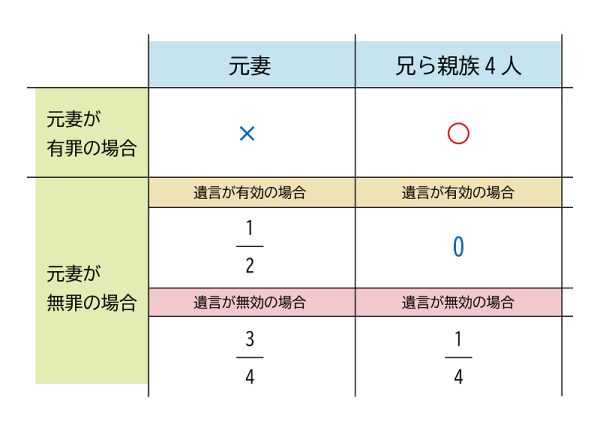 兄ら親族4人は遺言が有効なら0、遺言が無効だった場合で元妻が無罪であれば4分の1をもらえる。遺言が無効・元妻が有罪となると100%。結構ややこしいというか、多分さっき言った通り、お金が渡されて眼の前にあっても5年10年は使えない状況になってしまっているんじゃないかなとは思います。