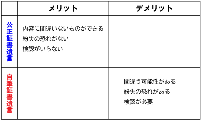 まず、公正証書遺言のメリットです。確実に内容に間違いないものができます。これに対する自筆証書遺言のデメリットは、間違いがある可能性があるということです。