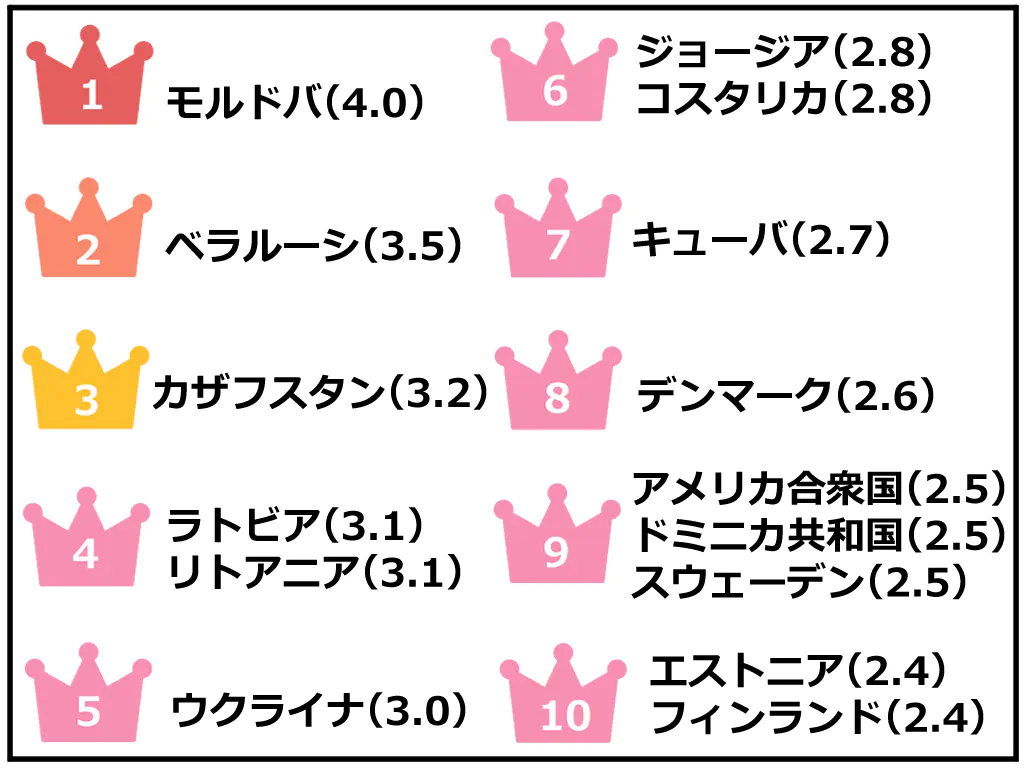 | 17 | 日本、イスラエル、キルギス、アルバニア、イギリス、ハンガリー、ポーランド、モーリシャス、ニュージーランド | (1.7) |
