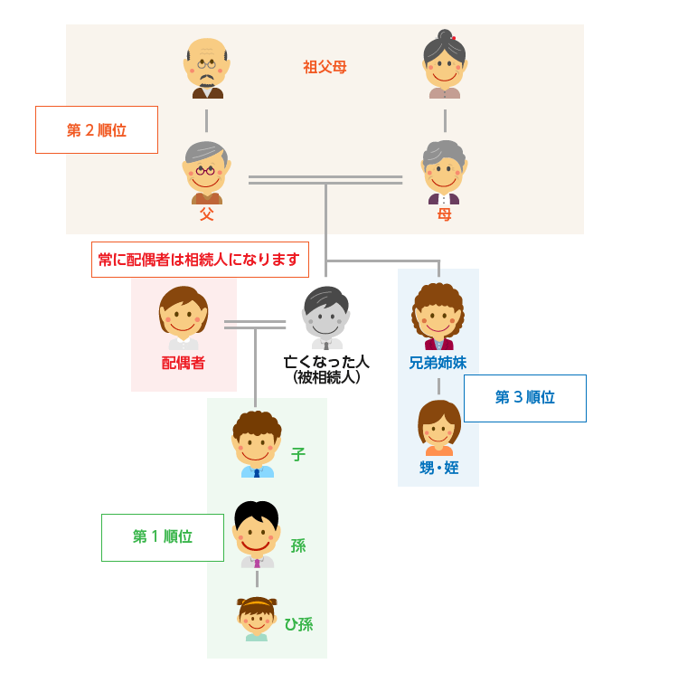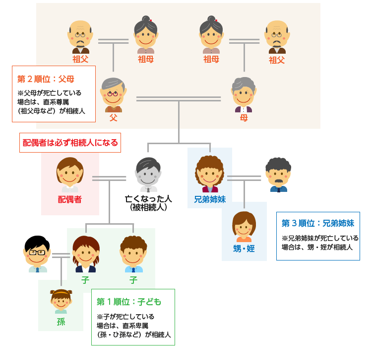 相続人は被相続人(亡くなった方)との続柄や家族関係によって順位が決まり、上位の順位がいる場合は下位の順位には相続権がありません。