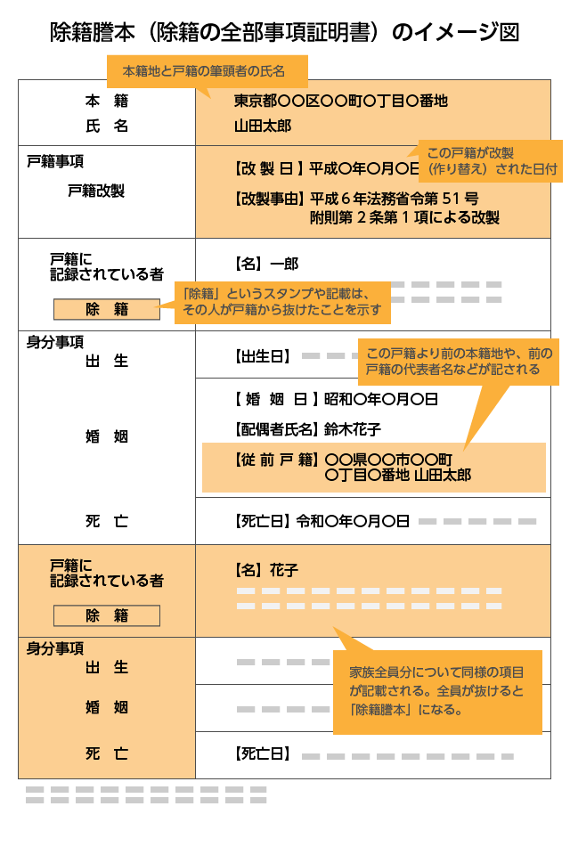 また、結婚や死亡、他の市区町村に転籍などで戸籍内の全員が抜けると除籍といい、その写しは「除籍謄本」といいます。
