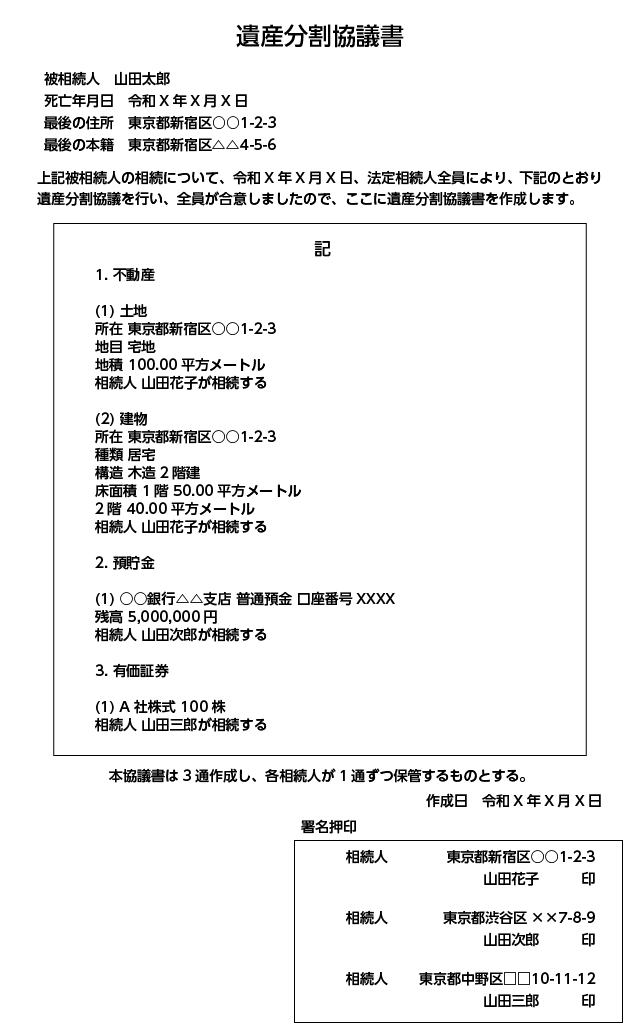 本協議書は3通作成し、各相続人が1通ずつ保管するものとする。